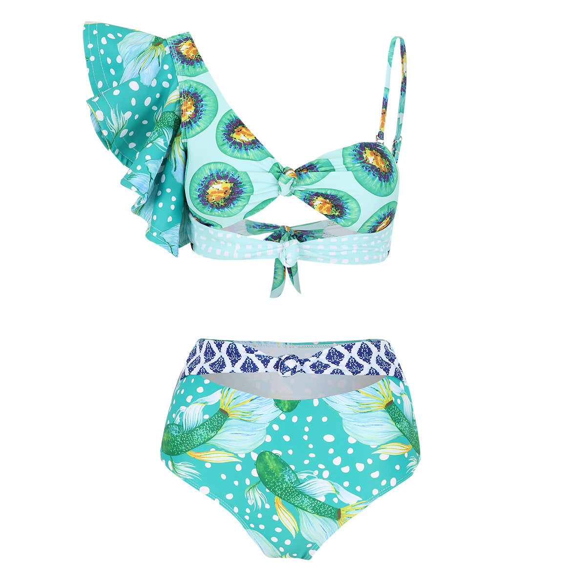 This women's bikini swimwear set showcases a refined peacock motif on a soothing light blue background. Designed with an accompanying skirt, it offers a blend of style and modesty, perfect for confident beachwear. The combination ensures both aesthetic appeal and comfortable wear for aquatic activities or sunbathing.