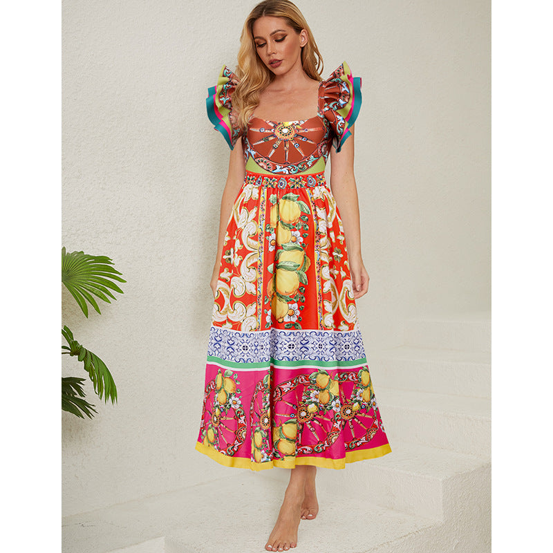 Women's vacation flower ruffles backless pink brown orange color lemon print one piece swimwear with skirt